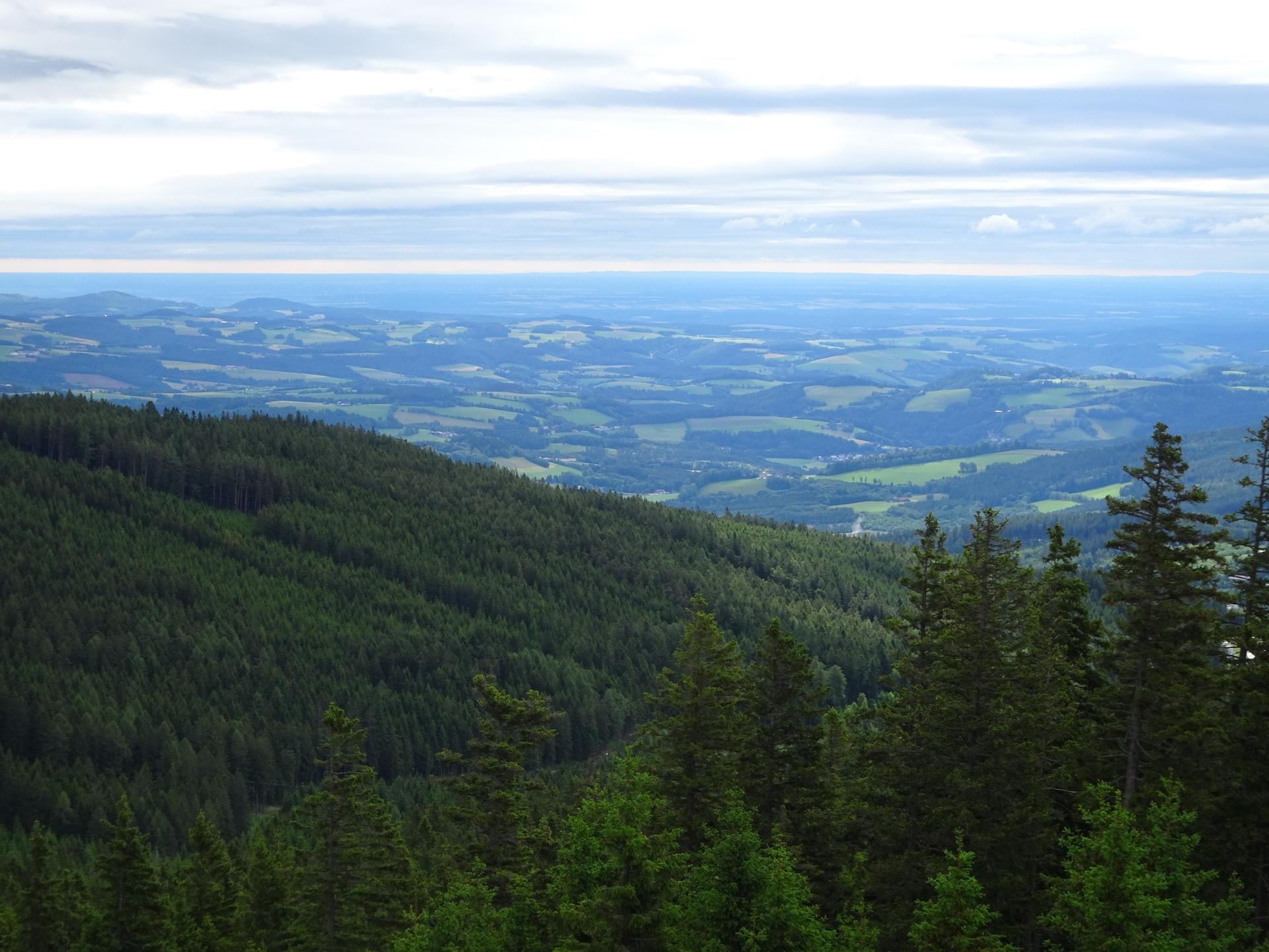 The tour then first heads back but follows the trail 834 up to the summit of Arabichl (2 Points for Gipfelstürmer) and then relatively flat eastwards. In the forest, the tour then turns right and follow the trail down to Feistritzer Schwaig (2 Points for Schwaig zu Schwaig) and then further eastwards to the Kampsteiner Schwaig (2 Points for Schwaig zu Schwaig). The tour then follows the trail eastwards up to the summit of Kampstein (2 Points for Gipfelstürmer), the last check-in point. The remaining tour simply follows the hiking trail 1 eastwards, bypassing the Herrgottschnitzerhütte and then descending down into the city of Aspang Markt. The very long tour then finally ends there at the train station.