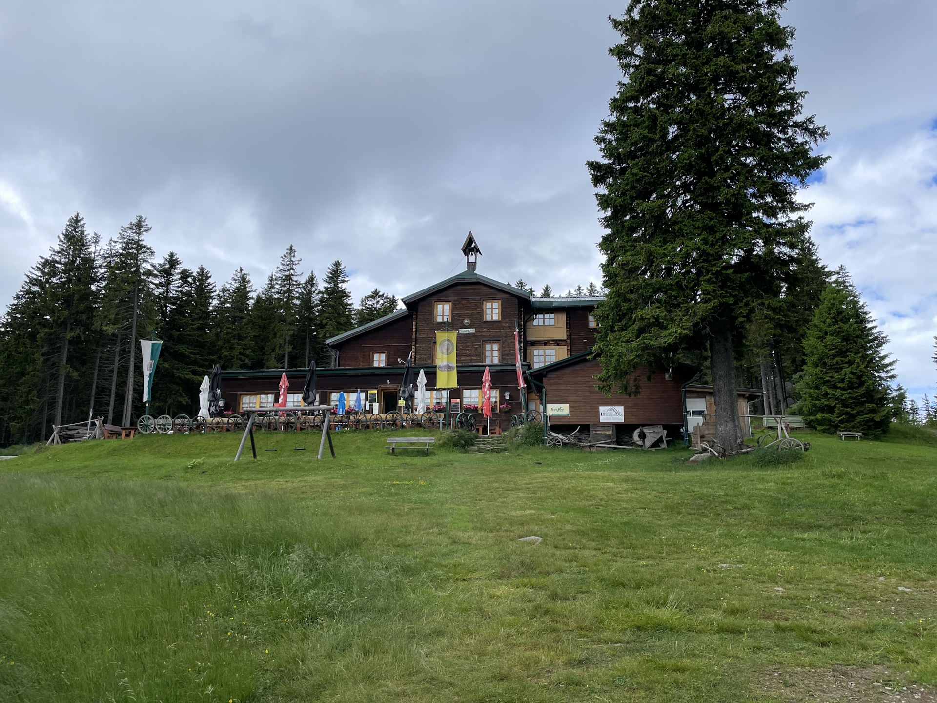 After a well-deserved break at the Wetterkoglerhaus, the tour follows the hiking trail Alpannonia northwestwards. When reaching the saddle, the tour keeps right and follows the direct (unmarked) trail up to the summit of Umschussriegel (2 Points for Gipfelstürmer) and then further northwards to Schöberlriegel (2 Points for Gipfelstürmer). The tour then continues northwards following the hiking trail to the Dreiländereck and further to the Kranichberger Schwaig (2 Points for Schwaig zu Schwaig). After another well-deserved break, the tour follows the trail northwards bypassing the Putzkreuz down to the Steyersberger Schwaig (1 Point for Schwaig zu Schwaig for another break.