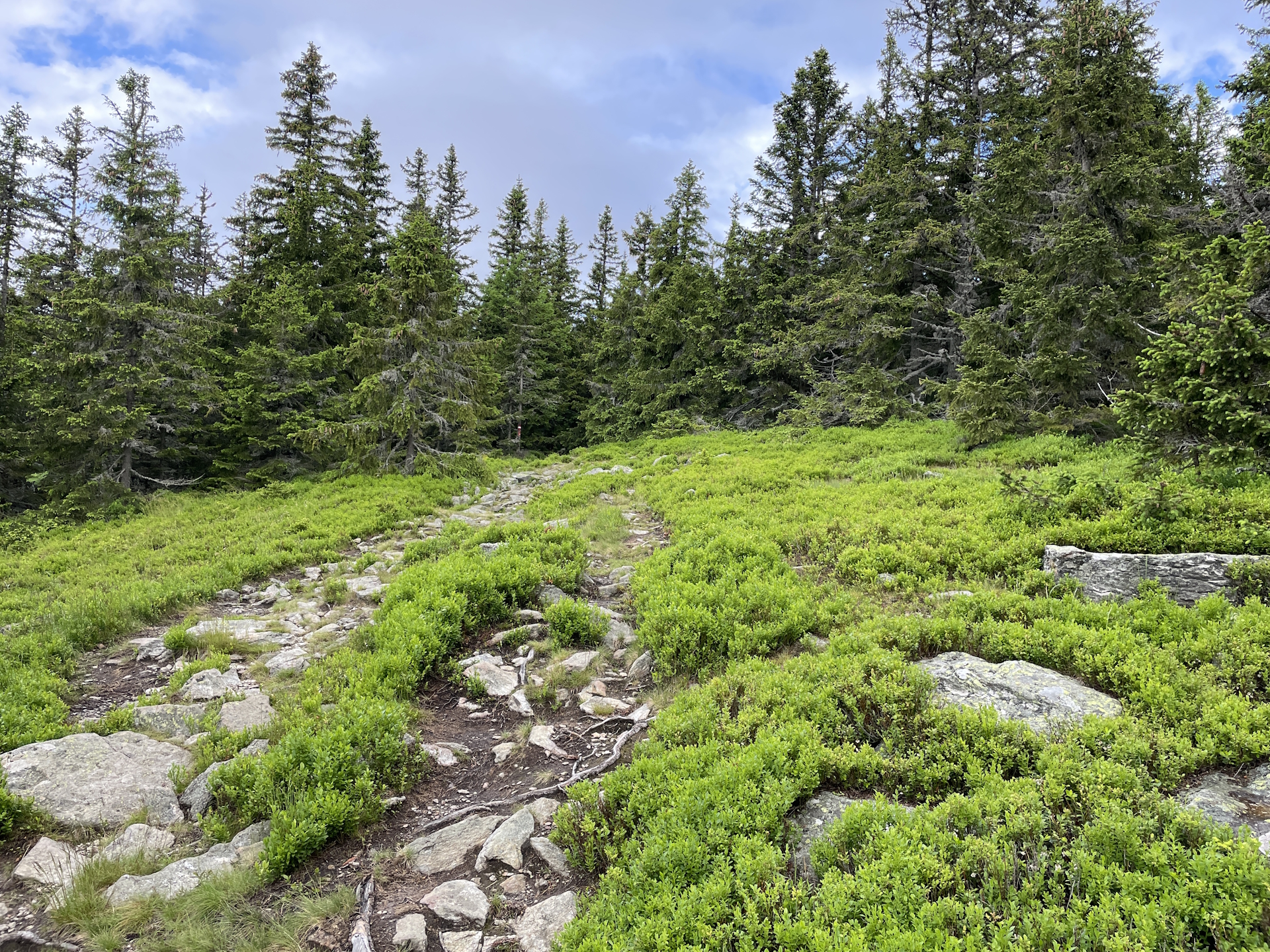09:00 Continue following the blue marked trail first northwards and then turn right. Descend down following the blue marked trail eastwards.