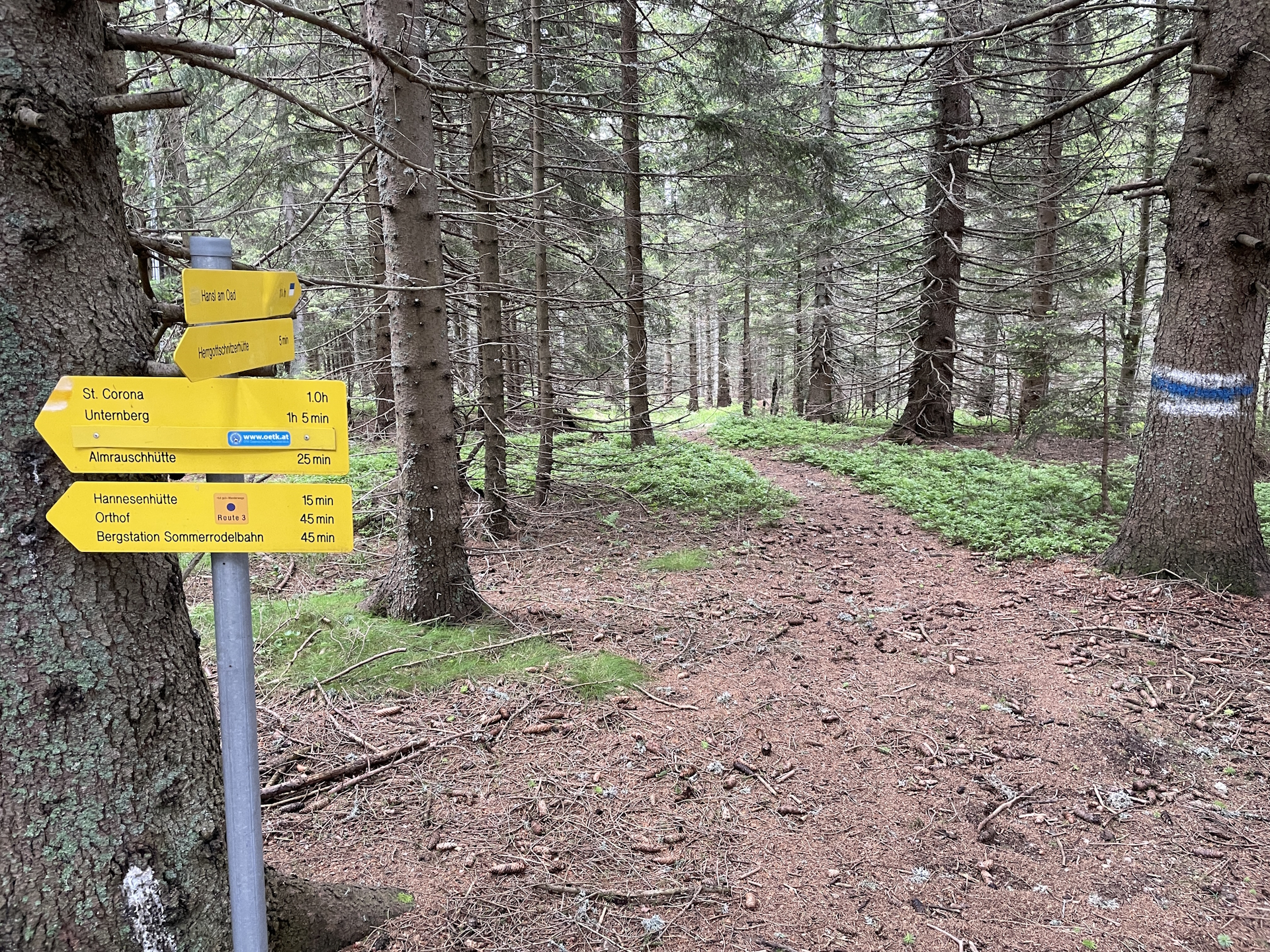 07:20 Bypass the Feistritzer Schwaig (SummitLynx checkpoint) and follow the trail heading north back to the main hiking trail. Optionally, you can continue following the forest road straight which will rejoin the hiking trail later.