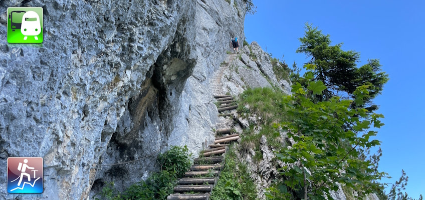 The tour starts at the bus station Glanegg Ortsmitte and first the trail AV Weg 410 southwards following the road heading towards the already visible Untersberg. The very well marked tour then heads through the forest towards the start of the Dopplersteig. The Dopplersteig first ascends using stairs and then follows a relatively easy trail alongside the Rosittenbach river. The trail becomes more and more alpine and uses very often demanding stairs (either wooden stairs, carved out of stone or iron ladders) till finally reaching the impressive alpine pasture of Obere Rositten. The water source as well as the scenic view from there invite for a break before the trail heads directly to the impressive rock wall. Again, the trail ascends using steep stairs (wooden or carved out of stone), this time very exposed but well protected with fix ropes till finally reaching the Taxhamer Kreuz with its very impressive view towards the city of Salzburg. The route then continues following the easy trail 10 southwards towards the Zeppezauerhaus. After a well-deserved break, the tour then continues following the trail which leads directly up to the mountain station of the cable car and the impressive summit of Geiereck close-by. But before, the tour continues following the trail southwards on an easy gravel road towards the summit of Salzburger Hochthron, allowing an amazing distance view to Watzmann.