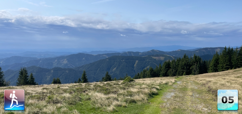 Eighteenth stage of the Nord-Süd-Weitwanderweg 05 starting from the Mugelschutzhaus towards the Fensteralm and Plotscherbauer