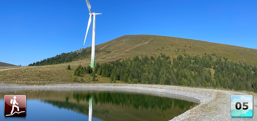 | 00:10 | At the barrier, keep left and continue the marked trail alongside the ski slope southwards towards the already visible wind generator. |